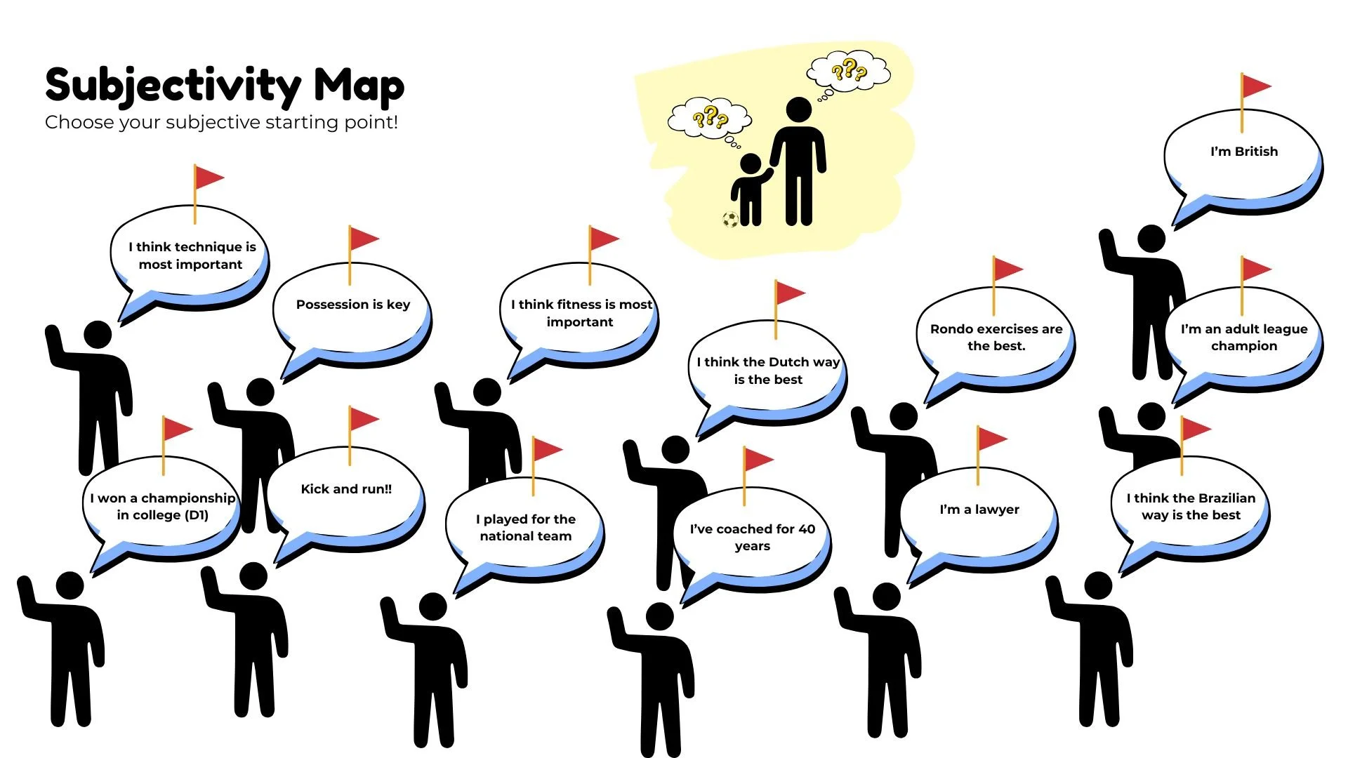 The image above shows a parent and child confused about which coach can provide proper football development. With so many subjective options to choose from, which one should they pick? The answer is: NONE!